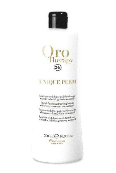 Fanola Oro Therapy Unique Perm Ammóniamentes tartós dauervíz 500 ml: Ammónia mentes innovatív, kiegyensúlyozott krémes formula, mely nagyszerűen alkalmas a haj volumenének növeléséhez, a rugalmas és tartós hullámok kialakításhoz anélkül, hogy módosítaná a festett haj fényét. Minden hajtípusra alkalmas. A dauervíz használata közben 5 percenként ellenőrizze a haj gönd