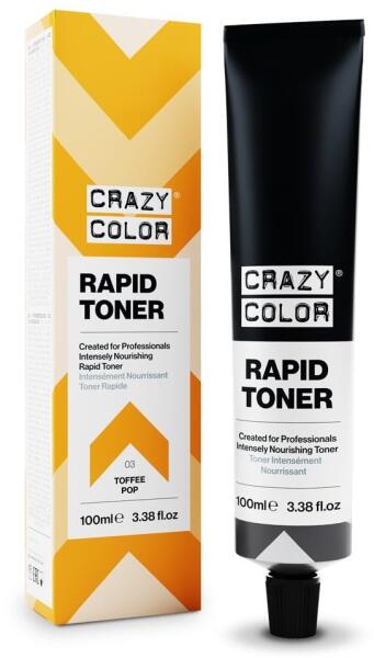 Crazy Color Rapid Toner 03 Toffee Pop 100 ml: A fodrászokkal folytatott konzultációk során igény mutatkozott egy új termékcsaládra, melyet most létrehoztunk, kifejezetten a profi fodrásszalonok számára! Ez az új termékcsalád tartalmazza a Crazy Color Rapid Tonereket 8 árnyalatban, a Cream Developer 6, 20 és 30 volumenben, valamint az új High Lift Violet Lightener-t. Rapid tonerek
