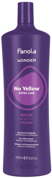 FANOLA WONDER No Yellow Extra Care Mask Vegan 1000 ml: A Fanola Wonder No Yellow Extra Care Mask 1000 ml rendkívül puhává, hidratálttá és fényessé varázsolja a hajat, miközben ellensúlyozza a nem kívánt sárga pigmenteket. A Wonder No Yellow maszk erősíti és meghosszabbítja a Wonder No Yellow sampon hatását azáltal, hogy lezárja a haj pikkelyeit. A formula ibolya pigmentet ta