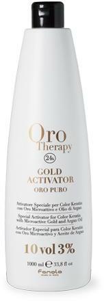Fanola Oro Therapy 24k Gold Aktivátor 10 VOL. 3% 1000 ml: A FANOLA Oro Therapy Gold aktivátort Fanola tervezte az Oro Therapy Gold ammóniamentes hajfesték családhoz, annak hatásának és kíméletességének a fokozására. Ez egy egyszerű keverék a formulához, amely gazdagítja a színt és segít fenntartani a haj egészségét. 24 karátos aranyat és arganolajat használ aktív össze