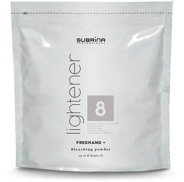 Subrina Professional Freehand Lightener szőkítőpor 8 árnyalat világosításra 400gr 60590Szabadkezes szőkítő por a trendi frizurák alkotásához, mint a Balayage, az Ombre vagy a Sombre. Az anyag textúrájú formula megakadályozza a foltok kialakulását fólia használata nélkül is. A legfontosabb összetevője a pektin, amely „biztonsági hálót képez a haj körül, és megakad