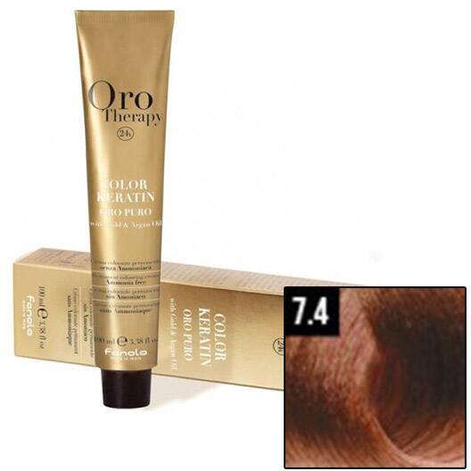 FANOLA ORO Therapy 24K Ammonia Free Permanent Color 7.4 100 ml: A Fanola Oro Therapy 24K Ammonia Free Permanent Color tartós ammóniamentes hajfesték ideális a tökéletes divatszínek kíméletes megfestésére. A színpigmenteket a hajfestékben az arany mikrorészecskék aktiválják és felerősítik, amelyek a haj szerkezetébe jutnak. Segít megőrizni a haj egészséges állapotát a ker