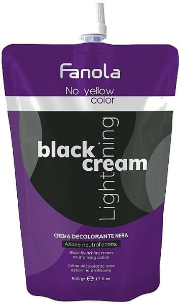 FANOLA No Yellow Black CREAM Lightening 500 g: A fekete pigmentek semlegesítik a hajban található meleg árnyalatú melanint, természetesen szőke, semleges vagy platina tónust kölcsönözve a hajnak, a haj színmélységétől és az oxidáns erősségétől függően. A szőkítőkrém semlegesíti a besárgulást és gyönyörűen hamvas megjelenést eredményez. A gyümölcscukor-komplex