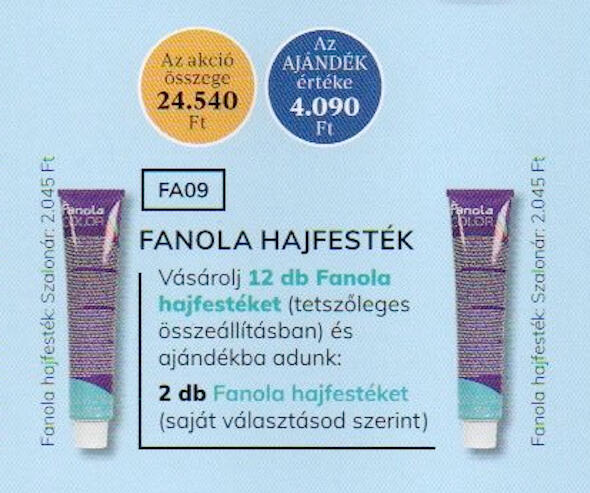 FA08 FANOLA Color hajfesték 12+ 2 FANOLA Color hajfesték AKCIÓ: Egy nagyszerű lehetőség, hogy kipróbáld a FANOLA Color 100 ml-es hajfestéket még kedvezőbb áron! Vásárolj 12 db FANOLA Color 100 ml hajfestéket és mi megajándékozunk: Ajándék termékek: - 2 db FANOLA Color hajfesték Az ajándék értéke: 4090- Ft A megrendelni kívánt hajfestékek pontos színkód számát és d