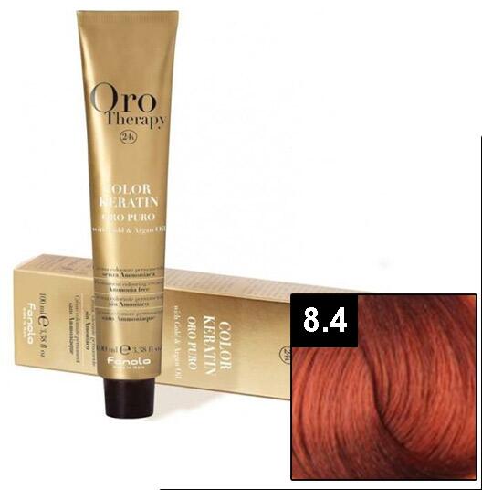 FANOLA ORO Therapy 24K Ammonia Free Permanent Color 8.4 100 ml: A Fanola Oro Therapy 24K Ammonia Free Permanent Color tartós ammóniamentes hajfesték ideális a tökéletes divatszínek kíméletes megfestésére. A színpigmenteket a hajfestékben az arany mikrorészecskék aktiválják és felerősítik, amelyek a haj szerkezetébe jutnak. Segít megőrizni a haj egészséges állapotát a ker