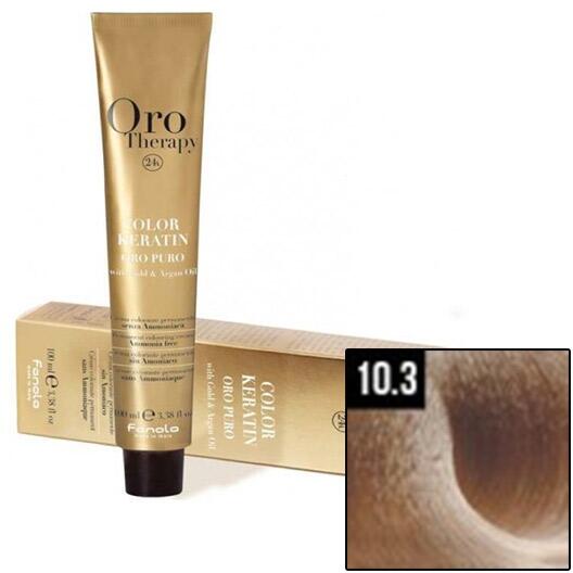 FANOLA ORO Therapy 24K Ammonia Free Permanent Color 10.3 EXTRA 100 ml: A Fanola Oro Therapy 24K Ammonia Free Permanent Color tartós ammóniamentes hajfesték ideális a tökéletes divatszínek kíméletes megfestésére. A színpigmenteket a hajfestékben az arany mikrorészecskék aktiválják és felerősítik, amelyek a haj szerkezetébe jutnak. Segít megőrizni a haj egészséges állapotá