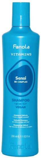 FANOLA VITAMINS Sensi Be Complex Shampoo Vegan 350 ml Kíméletes SLS/SLES mentes sampon érzékeny fejbőrre. Vitaminok és speciális hatóanyagok tökéletes kombinációja a fejbőr és a haj egészségéért. A Be Complex egy innovatív, B és E vitaminból álló komplex, amely képes hatékonyan ellensúlyozni a fejbőr rendellenességeit okozó problémákat, mint a hajhullás, zsíros, ko