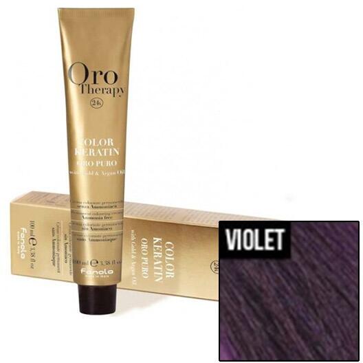 FANOLA ORO Therapy 24K Ammonia Free Permanent Color Korrektor VIOLET 100 ml: A Fanola Oro Therapy 24K Ammonia Free Permanent Color tartós ammóniamentes hajfesték ideális a tökéletes divatszínek kíméletes megfestésére. A színpigmenteket a hajfestékben az arany mikrorészecskék aktiválják és felerősítik, amelyek a haj szerkezetébe jutnak. Segít megőrizni a haj egészséges áll