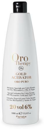 Fanola Oro Therapy 24k Gold Aktivátor 20 VOL. 6% 1000 ml: A FANOLA Oro Therapy Gold aktivátort Fanola tervezte az Oro Therapy Gold ammóniamentes hajfesték családhoz, annak hatásának és kíméletességének a fokozására. Ez egy egyszerű keverék a formulához, amely gazdagítja a színt és segít fenntartani a haj egészségét. 24 karátos aranyat és arganolajat használ aktív össze
