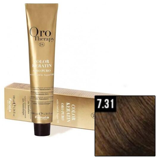FANOLA ORO Therapy 24K Ammonia Free Permanent Color 7.31 100 ml: A Fanola Oro Therapy 24K Ammonia Free Permanent Color tartós ammóniamentes hajfesték ideális a tökéletes divatszínek kíméletes megfestésére. A színpigmenteket a hajfestékben az arany mikrorészecskék aktiválják és felerősítik, amelyek a haj szerkezetébe jutnak. Segít megőrizni a haj egészséges állapotát a ke
