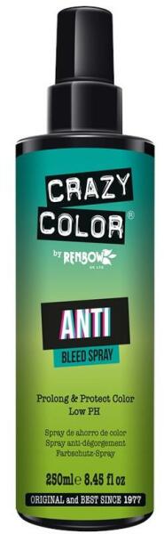 Crazy Color Anti Bleed Spray 250 ml: Meghosszabítja és megóvja a festett hajszín tartósságát. Használható bármilyen festékkel, színezővel festett hajra. Az élénk színek akár 20 EXTRA mosáshoz rögzíthetőek, ha bármilyen szalonkezelés után alkalmazzák. Lényegében az Anti Bleed Spray megakadályozza a színpigmentek "távozását" a hajból, meghosszabbítja a hajszín tart