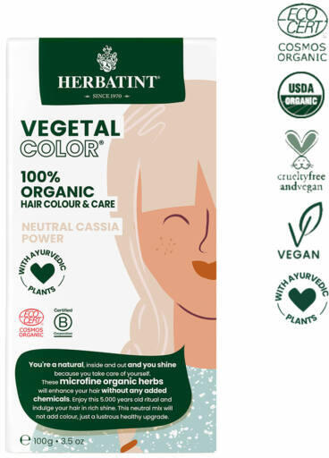 Herbatint vegetal color neutral cassia hajfesték 100 g Herbatint Vegetal Color 100%-ban bio tanúsított hajfesték, mely egyszerre ápolja és színezi a hajat. Kizárólag felelősségteljesen termesztett festőnövényekből és ayurvédikus növényekből, használatra kész keverék, a haj festésére, táplálására és regenerálására. Legyen különleges és természetes! Fedezze fel