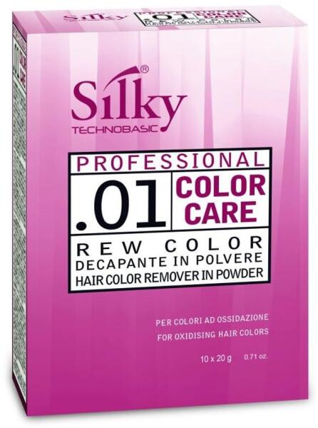 Silky Rew Color hajradír, 10x20 g- Hajszínleszedő por a hajfestékek színpigmentjeinek eltávolításához - Retusál, javítja és eltávolítja a hajfestéket anélkül, hogy a haj eredeti színét befolyásolná és a hajszálak természetes pigmentjeit megváltoztatná - A Silky Rew Color hajradír finom hatása révén a hajszerkezetet érintetlenül hagyja, és nem világosítja a termé