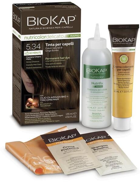 Biokap NutriColor Rapid tartós hajfesték Nr 5.34 Honey Chestnut, 135 ml - Színez, táplál, erősít- Hatóideje: 10 perces- Hosszantartó természetes színek, az ősz haj optimális fedéséért- A benne található bio argánolaj és tricorepair komplex segít újraépíteni a hajszerkezetet- Rizsfehérje és fűzszármazék tartalma védi a hajszínt a festés során- A fejbőr védelméér