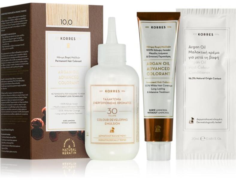 Korres Argan Oil, 50 ml, Tartós hajfesték nőknek, A minőségi Korres Argan Oil hajfesték intenzív árnyalatot és ragyogó fényt ad a hajának. Tulajdonságok: elfedi az őszülést hosszan tartó hatású egyszerű és gyors alkalmazás az otthon kényelmében egészségessé és selymes tapintásúvá teszi a hajat a szín sokáig szép és telt marad Használata: A csomagoláson feltünt