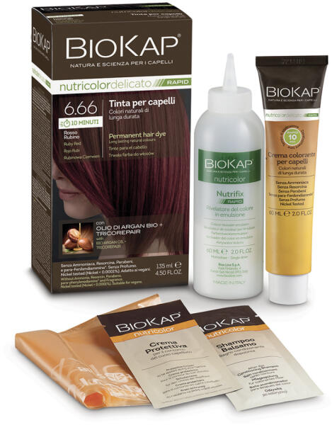 Biokap NutriColor Rapid tartós hajfesték Nr 6.66 Ruby Red, 135 ml - Színez, táplál, erősít- Hatóideje: 10 perces- Hosszantartó természetes színek, az ősz haj optimális fedéséért- A benne található bio argánolaj és tricorepair komplex segít újraépíteni a hajszerkezetet- Rizsfehérje és fűzszármazék tartalma védi a hajszínt a festés során- A fejbőr védelméért lipo