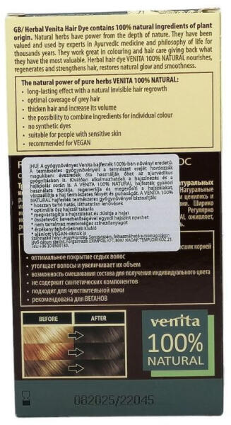 100% Naturla + Vegán gyógynövényes növényi hajfesték. 100 g-os gyógynövényes hajfesték; Venita termék hajfestéshez.