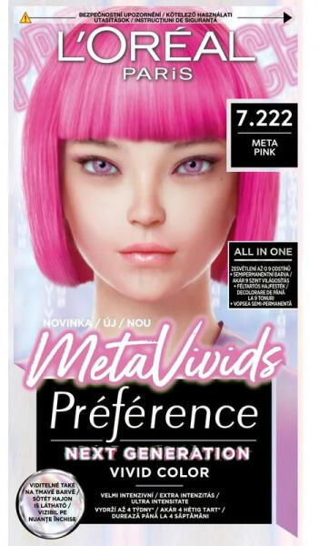 A Meta Vivids hajfestéket a virtuális világ ihlette, és a legnépszerűbb színes árnyalatokban kaphatók. Az új All-In-One csomagban a Préférence Világosító és a féltartós szín egy csomagban található. Ennek a kombinációnak köszönhetően a Préférence Meta Vivids festékek sötét hajra is alkalmasak.