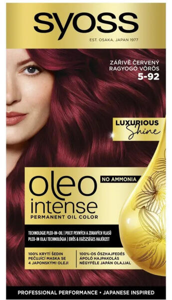 Termékleírás Jellemzők Plex-In olaj technológia, Erős & egészséges hajérzet, 100%-os őszhajfedés, Ápoló hajpakolás négyféle japán olajjal Termék információk Syoss Oleo Intense tartós hajfesték 5-92 Ragyogó vörös - Ammóniamentes hajfesték az egészséges színért. Ezt az ammóniamentes, mélyen hidratáló hajfestéket úgy tervezték, hogy gyengéd legyen a hajhoz,