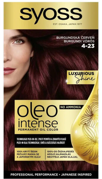 Termékleírás Jellemzők Plex-In olaj technológia, Erős & egészséges hajérzet, 100%-os őszhajfedés, Ápoló hajpakolás négyféle japán olajjal Termék információk Syoss Oleo Intense tartós hajfesték 4-23 Burgundi vörös - Ammóniamentes hajfesték az egészséges színért. Ezt az ammóniamentes, mélyen hidratáló hajfestéket úgy tervezték, hogy gyengéd legyen a hajhoz,