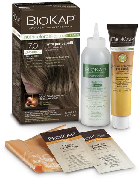 HajfestésBiokap NutriColor Rapid tartós hajfesték Nr 7.0 Natural Medium Blond, 135 ml - Színez, táplál, erősít- Hatóideje: 10 perces- Hosszantartó természetes színek, az ősz haj optimális fedéséért- A benne található bio argánolaj és tricorepair komplex segít újraépíteni a hajszerkezetet- Rizsfehérje és fűzszármazék tartalma védi a hajszínt a festés során- A fejb