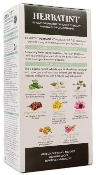 Tartós hajfesték, mely tökéletes fedést biztosít az ősz hajszálakon is, táplálva és védve a fejbőrt illetve a hajszálakat, mindezt a haj károsodása nélkül. 150 ml-es hajfesték; Herbatint termék hajfestéshez.