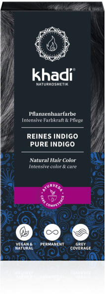 Khadi bio hajfesték por kékesfekete-indigó 100 g Érezd a 100% Indigó erejét. A Khadi 100% Indigó Növényi Hajfestékkel hajadat sötét, kék csillogású mélyfeketére festheted. Hagyd, hogy elvarázsoljon a kékes fényjáték a hajadban. A növényi hajfesték 100%-ban növényi eredetű és vegán. Hiszen a Khadi 100% Indigó kizárólag tiszta indigót tartalmaz. Ez adja a mély feke