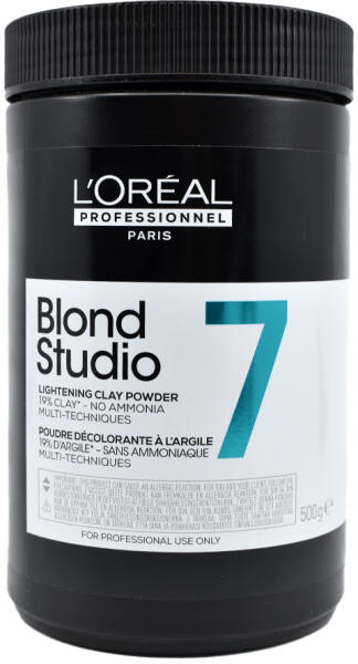 A L'Oréal Professionnel Blond Studio 7 Lightening Clay Powder professzionális világosító hajpúder agyaggal, 7 tónussal világosíthatja a hajat, és elsősorban baleage-hoz és a haj melírezéséhez tervezték. Világosító púderrel természetesen az átlagos világosító technikákkal is világosíthatja a haját. Oxidálószerrel keverve a púder gazdagon krémes állagúvá alakul, a