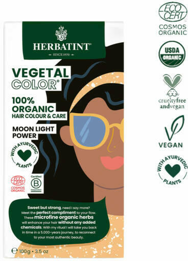Herbatint Vegetal Color 100%-ban bio, Ecocert tanúsított hajfesték Moon Light árnyalatban, egyszerre ápolja és színezi a hajat. Kizárólag felelősségteljesen termesztett festőnövényekből és ayurvédikus növényekből, használatra kész keverék, a haj festésére, táplálására és regenerálására. Kíméletes gazdálkodásból származó legkiválóbb növények használatáv