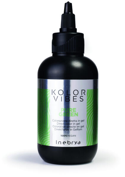 Inebrya Kolor Vibes vegán hajszinező gél, Pure Green, 150 ml - Féltartós direkt ammóniamentes hajszinező gél, oxigenta és ammónia nélkül - Zselés állagának köszönhetően könnyűszerrel eloszlatható egyenletesen a hajon - Savas pH értékű hajszinező, mely egy lépésben szinezi és lezárja a haj szerkezetét, azáltal tartósabb színeredmény érhető el - Természetes, fest