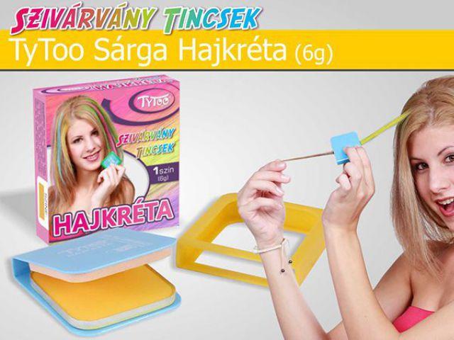 Hajkréta szett, szivárvány tincsek, 6g, sárga A TyToo hajkréta kozmetikai minőségű, kifejezetten emberi hajszínezésre használható! Nem roncsolja a hajadat, biztonságosan használhatod. Hasznos tippek a TyToo hajkrétáról: - Bármilyen alkalomra elkészítheted a tökéletes színösszeállítást vele - Nincs szükség semmilyen előkészületre, hisz a dobozban mindent megtalálsz