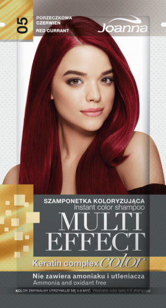 Joanna ribizli vörös hajszínező 35g 05 Hivatalos magyarországi forgalmazótól. Leírás: A Multi Effect Color hajszínező sampon a tündöklő színek egyszerű és gyors elérésére lett kifejlesztve. Gyengéd összetevői: a hajszínező sampon nem tartalmaz ammóniát se hidrogén peroxidot, ezért nagyon gyengéd a hajhoz. A multivitamin komplexumja hidratálja és táplálj