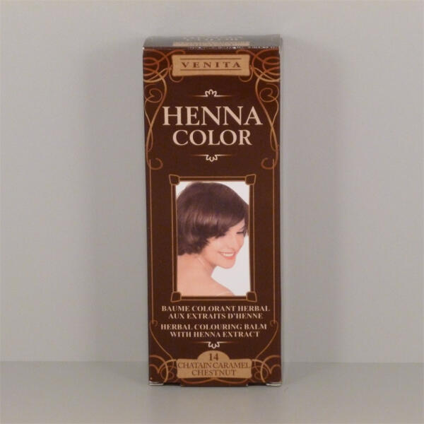 Henna Color szinező hajbalzsam nr 14 gesztenyebarna 75 ml Természetes hatóanyagú gyógynövényekből készült amóniamentes hajfesték, a gyógynövénykivonatok ápolják és óvják a hajat a festés közben, a henna kivonat pedig gondoskodik az egészséges csillogásról, hosszantartó, intenzív színélményt nyújt.