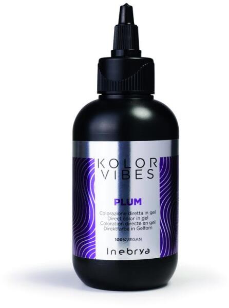 Inebrya Kolor Vibes vegán hajszinező gél, Plum, 150 ml- Féltartós direkt ammóniamentes hajszinező gél, oxigenta és ammónia nélkül - Zselés állagának köszönhetően könnyűszerrel eloszlatható egyenletesen a hajon - Savas pH értékű hajszinező, mely egy lépésben szinezi és lezárja a haj szerkezetét, azáltal tartósabb színeredmény érhető el - Természetes, festett és