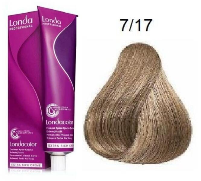 HajfestésLonda Color krémhajfesték 60 ml, 7/17- Extra krém bázisú Londa Professional hajfesték az élettel teli, ragyogó mikrogömbökkel, amelyek lehetővé teszik a hajfesték tökéletes beépülését valamennyi hajrostba - Fiatalos, vibráló színintenzitású és hosszantartó színárnyalatot biztosít a hajnak - Akár 100%-os ősz haj fedés érhető el a Londa Professional Londa