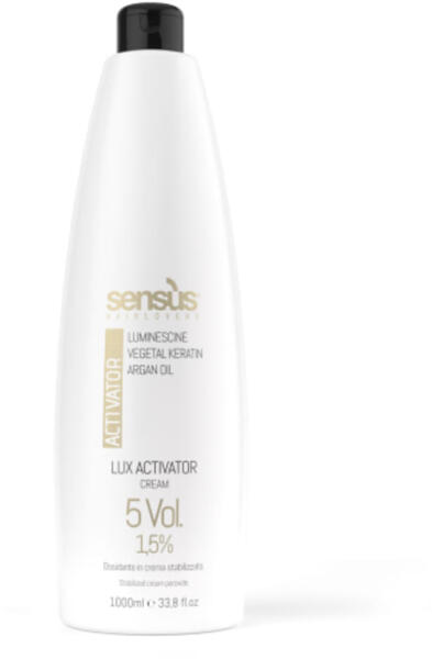 Sensus Activator Cream Lux 1,5% 5vol. Ez a luxus stabilizált oxidáló krém növényi keratinnal, argánolajjal és luminiscinnel dúsított, hogy a haj ragyogó és ellenálló legyen. Ideális professzionális hajfestési és világosítási eljárásokhoz. . Jellemzői:. Növényi keratin: 18 aminosav keveréke, amely erősíti és javítja a haj rugalmasságát. . Luminiscin: Az UV-sugarakat