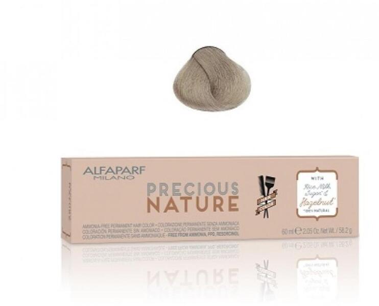 Alfaparf Precious Nature ammóniamentes hajfesték- Ammónia, -PPD, - és rezorcin mentes hajfesték - Természetes összetevőket, valamint rizstejet és cukrot tartalmaz - A rizstej kiválóan táplálja, míg a cukor gyönyörűen fényessé és csillogóvá varázsolja a hajat - Az Alfaparf Precious Nature 9.1-es hajfesték plusz összetevője a mogyoró, amely megvédi hajunk színét a kifak
