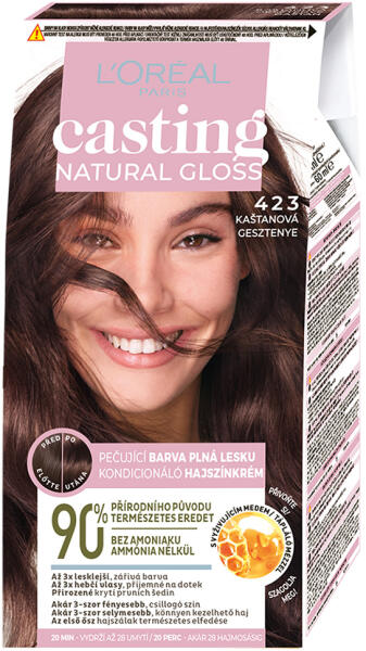 A L'Oreal Paris Casting Natural Gloss 90% természetes eredetű összetevőt tartalmaz, amelyek természetesen fedik el az első ősz hajszálakat. Minden tincset ápol és simít, ráadásul akár 3-szor fényesebbé és puhábbá varázsolja a hajat. Minden hajtípusra fejl