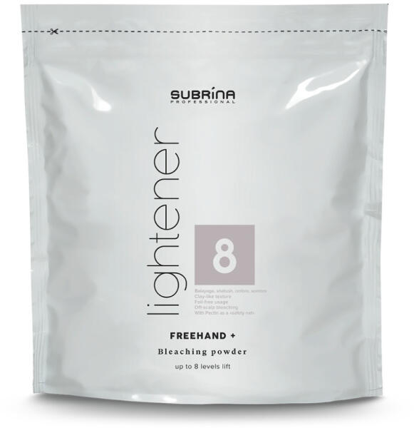Subrina Freehand szabadkezes 8 szőkítőpor, 400 g - 8 árnyalat világosításra is alkalmas szabadkezes szőkítőpor valamennyi szabadkezes technikához - Szabadkezes technikákhoz fejlesztett szőkítőpor a trendi frizurák alkotásához, mint a Balayage, az Ombre, a Sombre - Az agyag textúrájú formula megakadályozza a foltok kialakulását - A legfontosabb összetevője a pektin, amely
