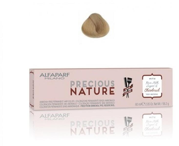 Alfaparf Precious Nature ammóniamentes hajfesték- Ammónia, -PPD, - és rezorcin mentes hajfesték - Természetes összetevőket, valamint rizstejet és cukrot tartalmaz - A rizstej kiválóan táplálja, míg a cukor gyönyörűen fényessé és csillogóvá varázsolja a hajat - Az Alfaparf Precious Nature 9.1-es hajfesték plusz összetevője a mogyoró, amely megvédi hajunk színét a kifak