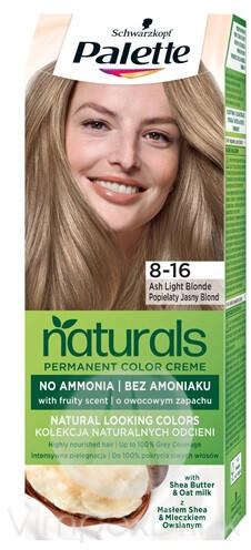 Termékleírás Termék információk Palette Permanent Naturals Color ápoló krémhajfesték 8-16 Hamvas világosszőke árnyalatban. Ammóniamentes tartós krémhajfesték tápanyagban gazdag Shea vajjal kifejezetten a szőkéknek választva. Többtónusú színpigmentek a természetes kinézetű, ragyogó szőke hajért, és árnyalattól függő őszhajfedésért. Az ápoló zabtejet tartalma