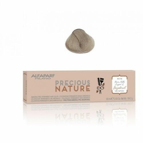 Alfaparf Precious Nature ammóniamentes hajfesték 9.1- Ammónia, -PPD, - és rezorcin mentes hajfesték - Természetes összetevőket, valamint rizstejet és cukrot tartalmaz - A rizstej kiválóan táplálja, míg a cukor gyönyörűen fényessé és csillogóvá varázsolja a hajat - Az Alfaparf Precious Nature 9.1-es hajfesték plusz összetevője a mogyoró, amely megvédi hajunk színét a k