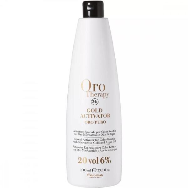 Fanola Oro Puro krémaktivátor 20 VOL 6%, 1 l - Krémes oxidálószer, amelyet kifejezetten a Fanola Oro Therapy ammóniamentes hajfestékkel való használatra terveztek - Mikroaktív arany- és argán olajjal gazdagított formulája optimális hajápolást kínál a festés során - Hatékonyan megakadályozza a haj károsodását és garantálja az intenzív és ellenálló, tartós színt Kis