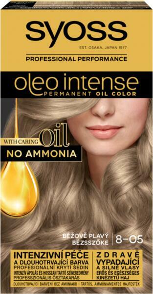 Syoss Oleo Intense tartós hajfesték 8-05 Bézsszőke - Ammóniamentes hajfesték az egészséges színért. Ezt az ammóniamentes, mélyen hidratáló hajfestéket úgy tervezték, hogy gyengéd legyen a hajhoz, miközben 100%-os őszhajszál fedést biztosít. A hajfestékben található ápoló olajok mélyen beszivárogtatják a színpigmenteket a hajszálakba, így gazdag és hosszan tartó