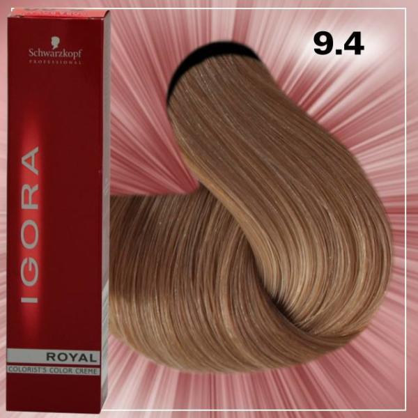 IGORA ROYAL 9-4 Extra Light Blonde Blonde Beige tartós krémhajfesték 100%-ig terjedő ősz haj fedéssel akár 9-es színmélységű hajalapon. A hajfesték mindenféle festési technikához használható. Bézs színirányt biztosít. Az IGORA ROYAL High Definition Technológia magas minőségű pigment mátrixokat használ a legtisztább tónusok, a tincshű eredmény, intenzív színek és a