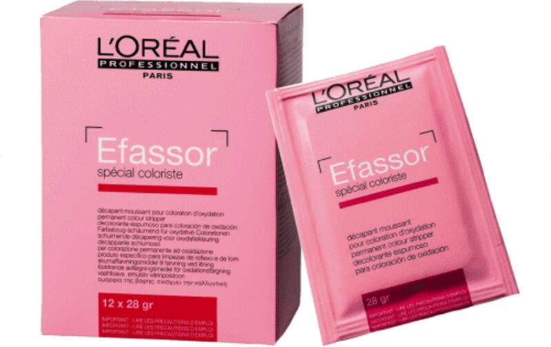 Loreal Professionel Efassor hajszín eltávolító por, 12x28 g- Használatával gyorsan és kíméletesen eltávolíthatjuk a mesterséges pigmenteket a hajból - Radírozáshoz (árnyalat eltávolítás) és tisztításhoz (világosítás) egyaránt alkalmazható Használata: - Radírozás esetében csomómentesen keverjük el a tasak port 60ml meleg vízzel egy műanyag tálban és a semleges s