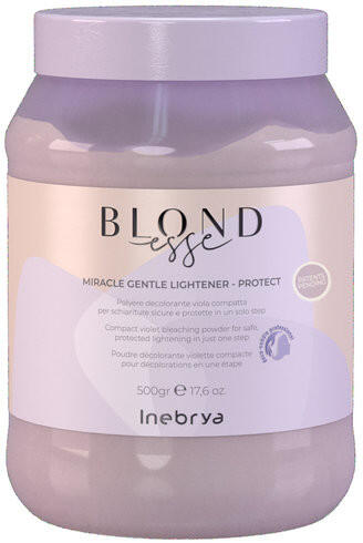 Inebrya Blondesse Miracle Gentle Protect szőkítőpor, 500 g - Lila szőkítőpor a biztonságos, gyengéd egy lépésben történő szőkítéshez - Közömbösíti a hajban lévő nemkívánatos sárgás pigmenteket - Ajánljuk meggyengült, roncsolt haj esetén is - 100%-os védelmet biztosít a hajszerkezetnek - Megóvja a hajvégeket a szétnyílástól - Aktív természetes növényi eredet