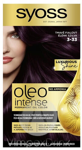 Termékleírás Jellemzők Plex-In olaj technológia, Erős & egészséges hajérzet, 100%-os őszhajfedés, Ápoló hajpakolás négyféle japán olajjal Termék információk Syoss Oleo Intense tartós hajfesték 3-33 Élénk szilva - Ammóniamentes hajfesték az egészséges színért. Ezt az ammóniamentes, mélyen hidratáló hajfestéket úgy tervezték, hogy gyengéd legyen a hajhoz, mi