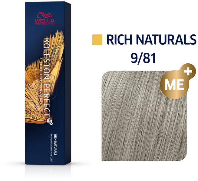 Hajfesték Wella Koleston Perfect Me+ Rich Naturals világosszürke szőke 9/81 60ml. A Wella Koleston Perfect festék egy krémes, konzisztens szín, amely könnyen eloszlatható a haj teljes felületén, egyenletes színű a haj gyökerétől a hajvégekig. Élénk, energikus színeket kölcsönöz a hajnak, amelyek kiválóan fedik a hajat és könnyen felvihetők Akár 5 lépéssel tónusról