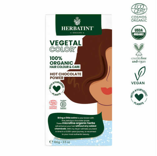 Herbatint Vegetal Color 100%-ban bio, Ecocert tanúsított hajfesték Hot Chocolate árnyalatban, egyszerre ápolja és színezi a hajat. Kizárólag felelősségteljesen termesztett festőnövényekből és ayurvédikus növényekből, használatra kész keverék, a haj festésére, táplálására és regenerálására. Kíméletes gazdálkodásból származó legkiválóbb növények használat
